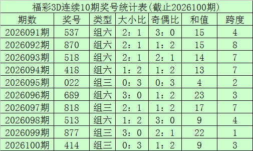 开奖回顾:福利彩票3D第26100期奖号开出414。奖号类型为组三,奇偶形态为偶奇偶,大小形态为小小小。